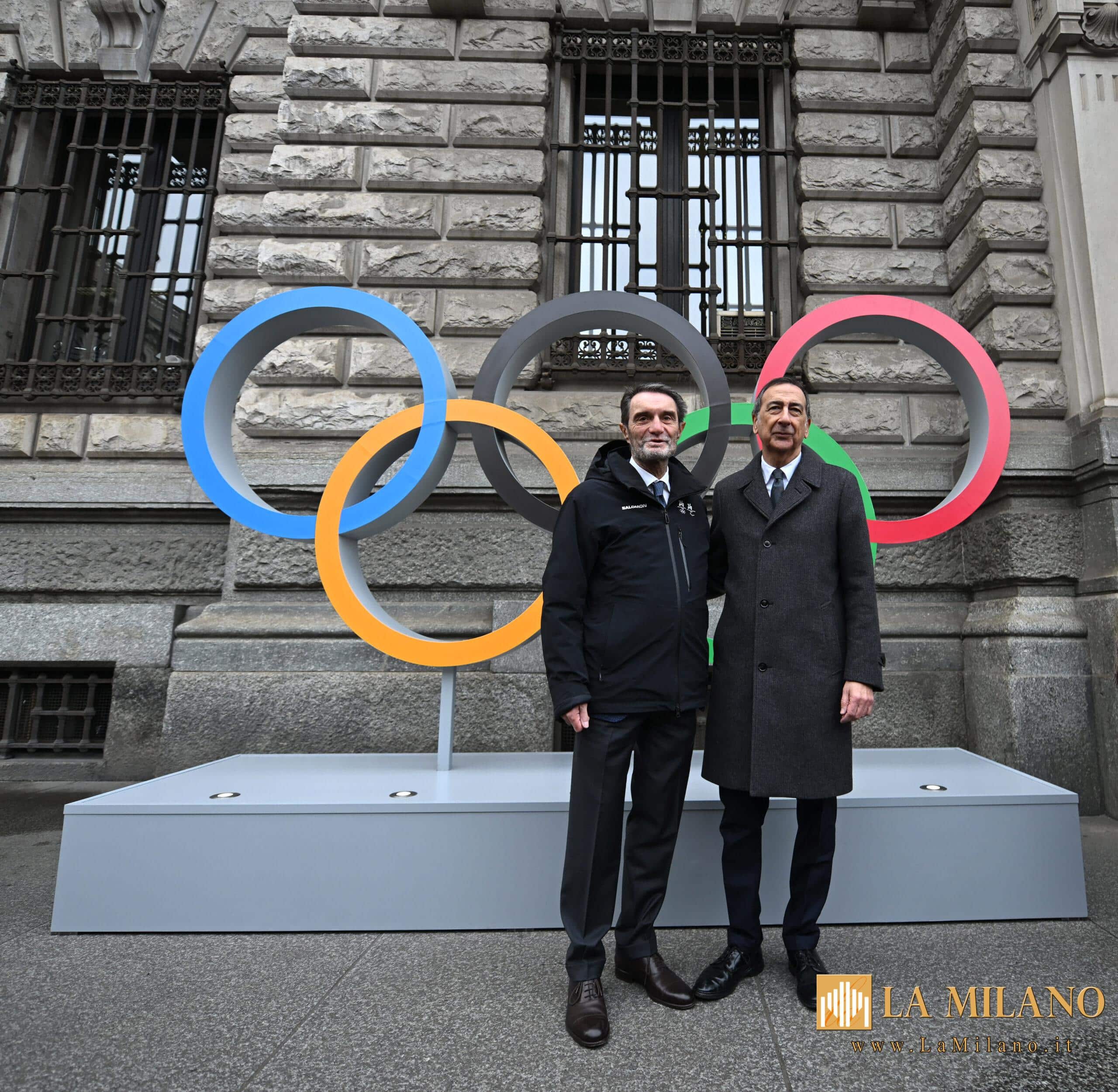 Milano Cortina 2026, in piazza Scala i cinque cerchi olimpici e gli Agitos paralimpici celebrano i “meno 2 anni” ai giochi invernali