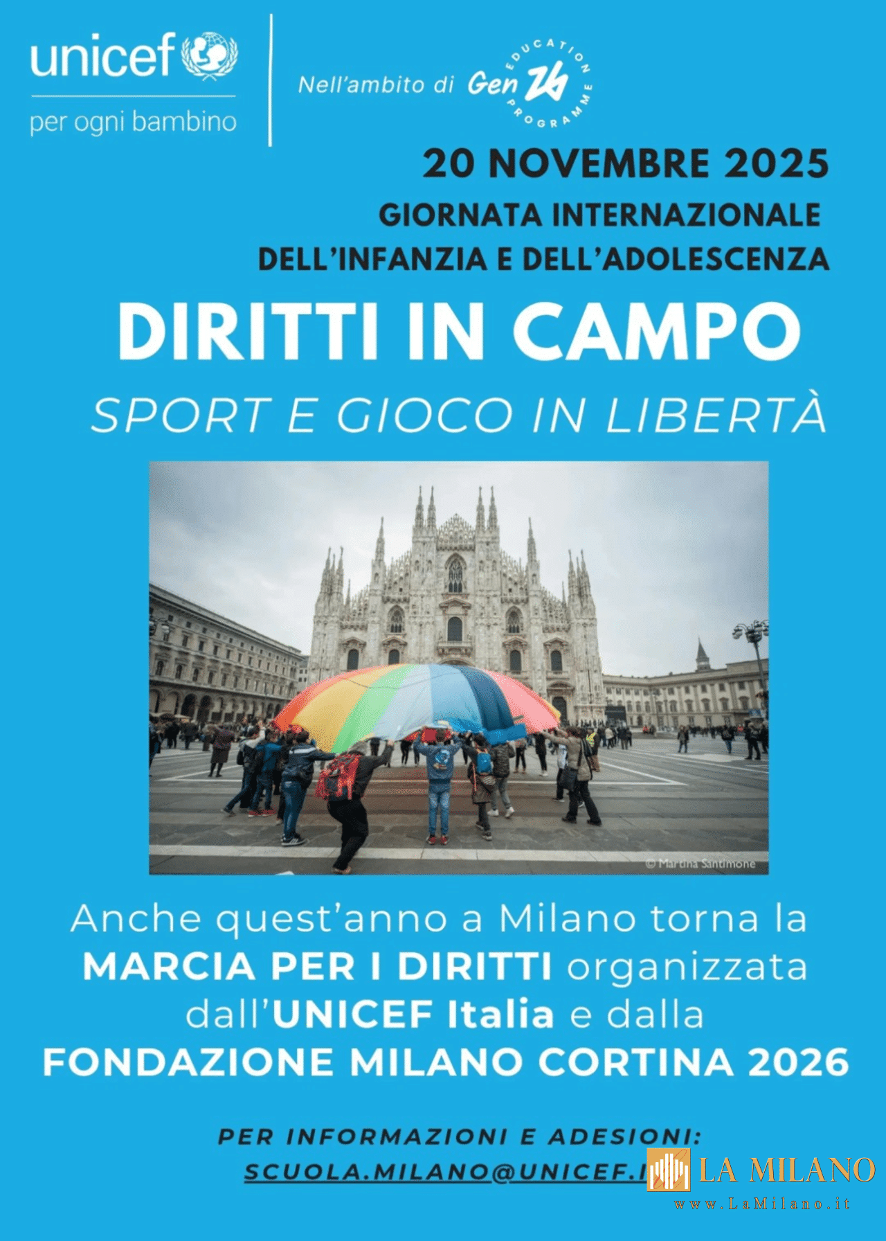Milano si prepara ad accogliere centinaia di bambini, bambine e adolescenti per una grande iniziativa dedicata alla Giornata Mondiale dell’Infanzia e dell’Adolescenza. Il 20 novembre, infatti, torna la Marcia dei Diritti di Milano, quest’anno organizzata nell’ambito del Programma Education Gen26 della Fondazione Milano Cortina 2026 e caratterizzata dal motto “Diritti in campo, sport e gioco in libertà”.